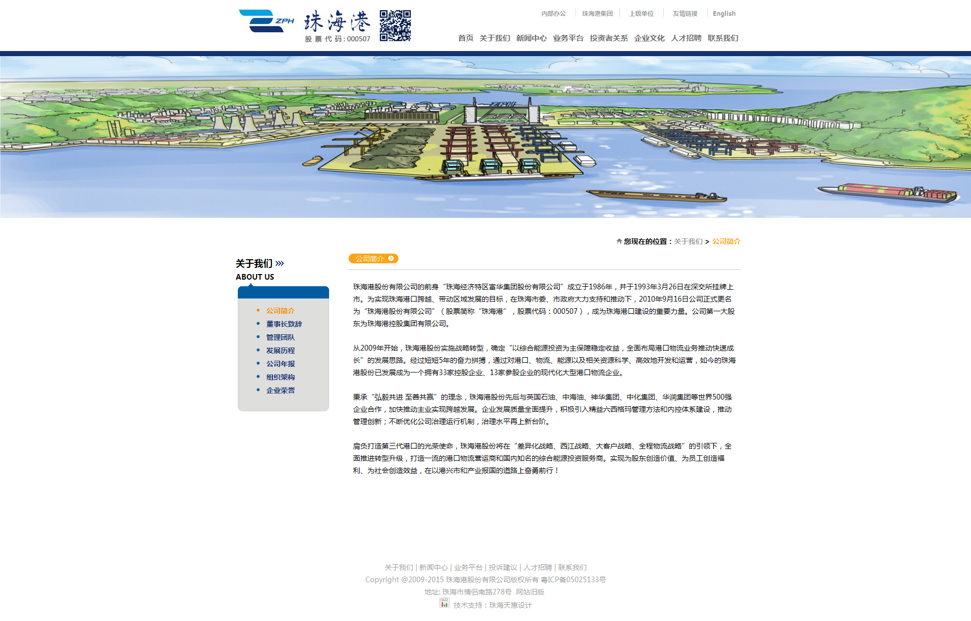 目前,公司通過產(chǎn)業(yè)整合、產(chǎn)業(yè)推進(jìn)、有序退出非主導(dǎo)產(chǎn)業(yè)等手段,重塑主業(yè),已初步形成以“港口物流、港口物流地產(chǎn)綜合開發(fā)、電力能源投資”為主的三大業(yè)務(wù)板塊。現(xiàn)下轄珠海港物流發(fā)展有限公司、珠海港置業(yè)開發(fā)有限公司、珠海匯通物流有限公司、珠海經(jīng)濟(jì)特區(qū)電力開發(fā)集團(tuán)有限公司、珠海富華投資有限公司、珠海經(jīng)濟(jì)特區(qū)富華物業(yè)管理公司、貴陽(yáng)富華藥業(yè)有限責(zé)任公司等7家企業(yè)。公司參股持有珠海富華復(fù)合材料有限公司、珠海碧辟化工有限公司、珠海可口可樂有限公司、珠海裕富通聚脂有限公司、武漢烽火富華電氣有限責(zé)任有限公司等5家企業(yè)。截止2009年12月30日,公司總資產(chǎn)為1,724,920,497.27元,2009年實(shí)現(xiàn)營(yíng)業(yè)收入410,791,728.00元,利潤(rùn)總額103,905,115.53元。