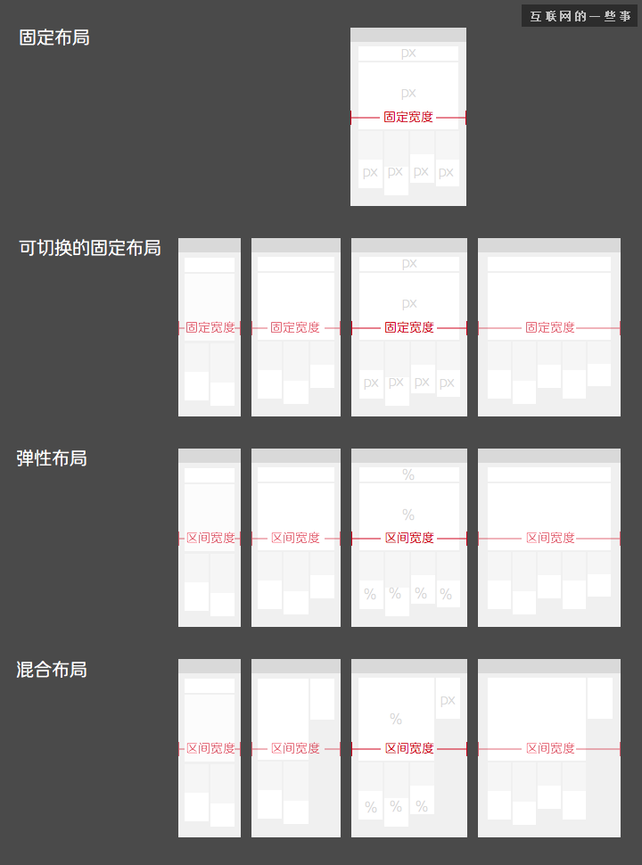 采用何種方式實(shí)現(xiàn)布局設(shè)計(jì),也有不同的方式,這里基于頁面的實(shí)現(xiàn)單位而言,分為四種類型:固定布局、可切換的固定布局、彈性布局、混合布局。
